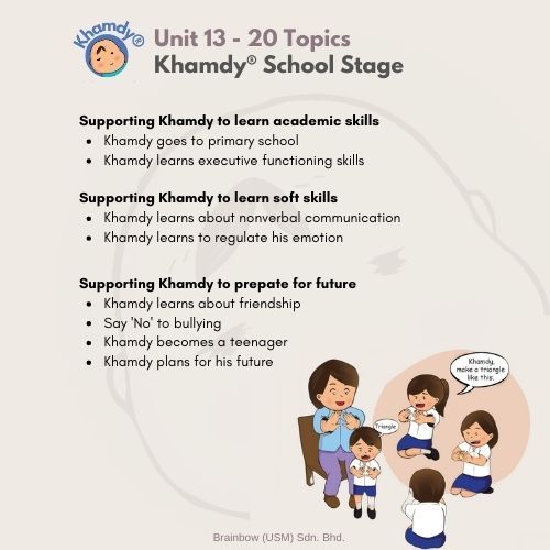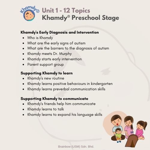 Khamdy® offers a new method for parents and educators to learn about strategies that help children with autism in inclusive environments. Parents and educators are introduced to more than 100 strategies to help children with autism communicate and learn effectively through a pictorial narrative method. A solution-focused approach is adopted to highlight the strategies introduced through the fictional story of a boy called Khamdy, who is closely supported by his loving parents and dedicated teachers in inclusive learning environments.